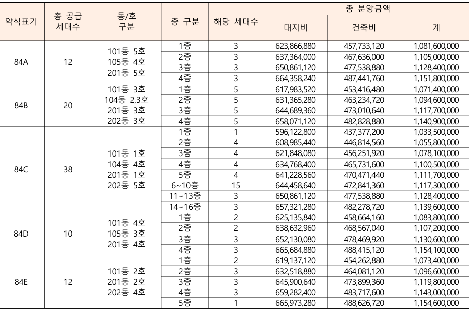 - 84D타입 : 최저 10.83억원 ~ 최고 11.54억원 [최저 평당 3,320만원 ~ 최고 평당 3,535만원]