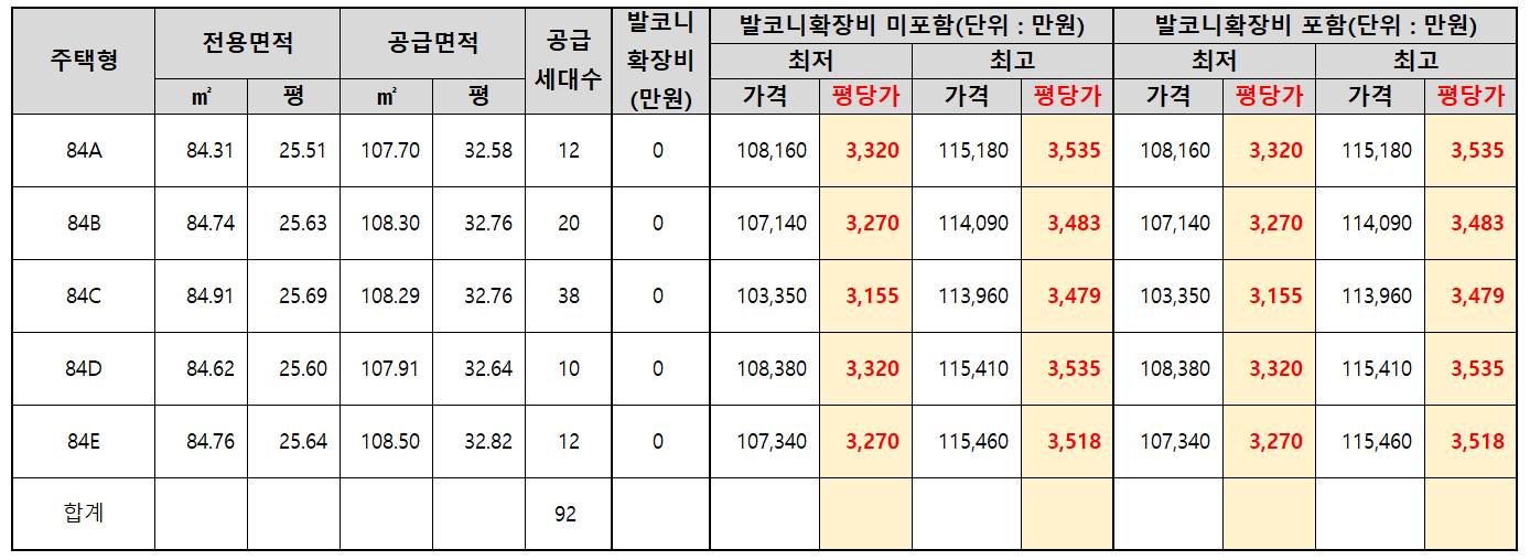 - 84E타입 : 최저 10.73억원 ~ 최고 11.54억원 [최저 평당 3,270만원 ~ 최고 평당 3,518만원]