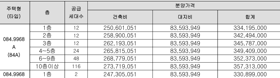 - 84A-2타입 : 최저 3.45억원 ~ 최고 3.68억원 [최저 평당 1,013만원 ~ 최고 평당 1,080만원]